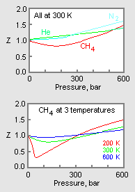 The upper graph in Figure 1 illustrates how the compressibility factor varies for different gases at the same temperature and pressure. The lower graph illustrates how the compressibility factor of a gas (for example, methane) at a given pressure varies with temperature.[1]
