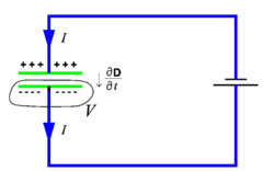In the figure on the right a capacitor (with green plates) is charged by an electric current I. The conduction current I is related to the current density J(r) by a surface integral. Since J is everywhere zero, except over the surface of the wire (blue in the figure), one may integrate over the whole closed surface of the volume V (see the figure) to get I,