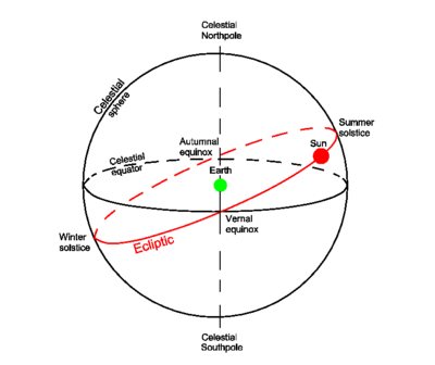 The intersections of the celestial equator and the ecliptic are the vernal equinox (the date in the spring of the Northern hemisphere that day and night are equally long, around March 21) and the autumnal equinox (the date in the fall that day and night are equally long, around September 21). The solstices are the dates that the Sun seems to stand still (around June 21 and December 21).
