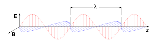 In figure 1 we see a snapshot (i.e., a picture at a certain point in time) of the magnetic and electric fields in adjacent points of space. In each point, the vector E is perpendicular to the vector B. The wave propagates to the right, along an axis which we conveniently refer to as z-axis. Both E and B are perpendicular to the propagation direction, which is expressed by stating that an electromagnetic wave is a transverse wave, in contrast to sound waves, which are longitudinal waves (i.e., air molecules vibrate parallel to the propagation direction of the sound).
