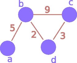 A weighted graph is a graph where there is some 'cost' associated with each arc. Usually, a little number will appear directly adjacent to every arc to express this price. A typical use of a weighted graph would be planning routes between locations on a map where the 'cost' associated with the arc would be the distance between the two locations.
