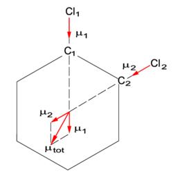 There is an approximate way of predicting the size of the molecular dipole moments. To each bonded pair of atoms a bond dipole is assigned and the bond dipoles are added vectorially to a total dipole moment of the molecule. Equal bonds have equal dipoles. The method is illustrated in figure 2 for the molecule orthodichlorobenzene that has two large bond dipoles μ1 and μ2 along the C–Cl bonds. The four C–H bond dipoles in the molecule are much smaller and are neglected. (The two C–H bond dipoles in meta position cancel mutually and the other two give a small modification of μ1 and μ2, respectively.)