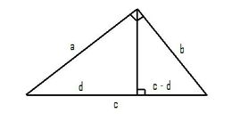 Take a right triangle with legs of length a and b and hypotenuse of length c. Draw a line from the right angle perpendicular to the hypotenuse as pictured. This line divides the hypotenuse into two segments. Suppose one of them has length d, then the other one has length c – d.