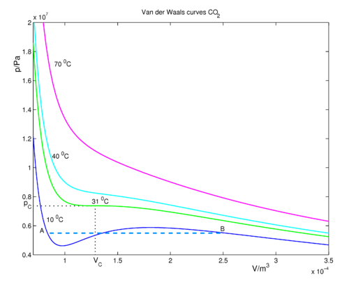 For large volumes (on the right-hand-side of the figure) the pressures are low and the fluid obeys approximately the ideal gas law pV = nRT for all temperatures shown. If we decrease the volume (go to the left in the figure along an isotherm), the pressure rises. Consider the (blue) isotherm of 10 0C, which is below the critical temperature. Decrease the volume until we reach the point B, where condensation (formation of liquid CO2) starts. At this point the van der Waals curve is no longer physical (excluding the possibility of the occurrence of an oversaturated, metastable gas), because in reality from B to the left (to smaller volume), the pressure stays constant—equal to the vapor pressure of the liquid. The real physical behavior is given by the dashed line of gas-liquid coexistence. The areas, bounded by the 10 °C isotherm, below and above the coexistence line are equal. This is the content of Maxwell's equal-area rule. Decreasing the volume further, we end at point A where all molecules are now in the liquid phase, no molecules are remaining in the gas phase. When the volume is diminished of a vessel that contains only liquid, the pressure rises steeply, because the compressibility of a liquid is considerable smaller than that of a gas.