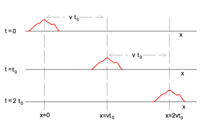 Any arbitrary differentiable function of the form f(x − vt) is a solution of the one-dimensional wave equation for constant (independent of x and t), real, and positive v. Hence any function f of x − vt may be called a wave. In contrast to what is often assumed, a wave (solution of the wave equation) does not have to be periodic, so that concepts like wave length and period are not necessarily defined. An example is given in Figure 1, where the red curve depicts an arbitrary wave propagating along the x-axis in positive direction. Snapshots at the times t=0, t=t0, and t=2t0 are depicted. At t=0 the red curve is the function f(x) that has non-zero values only in the neighborhood of x=0. At t=t0 the red curve has the very same shape, but has non-zero values only in the neighborhood of x=vt0. Note that the argument of f in the latter point on the x-axis is: x−vt0 = 0.