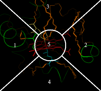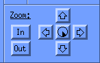 The molecular display is divided into five parts. Clicking in part 1 and 2 will rotate the molecule to the left and right. Clicking in part 3 and 4 will do +/- rotation around an other angle. Clicking in the center of the cross will produce a rotation around the z-axis. Holding down the Shift or Ctrl will rotate around the z-axis in the opposite direction. The center of the display can be moved by using the arrow buttons in the following part of the Molden Control Window: